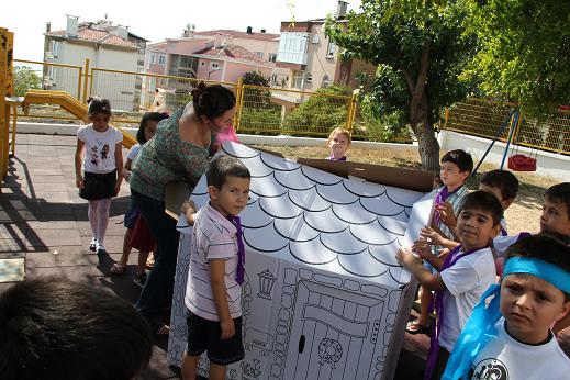 BAHÇEMİZDE YAPTIĞIMIZ ETKİNLİĞİMİZ DE ÇOCUKLARIMIZ ÖNCE KARTON EVLERİNİ KURDULAR SONRA DA BİR YARIŞ BAŞLADI Kİ SORMAYIN MÜZİK EŞLİĞİNDE KENDİ EVLERİNİ BOYADILAR.